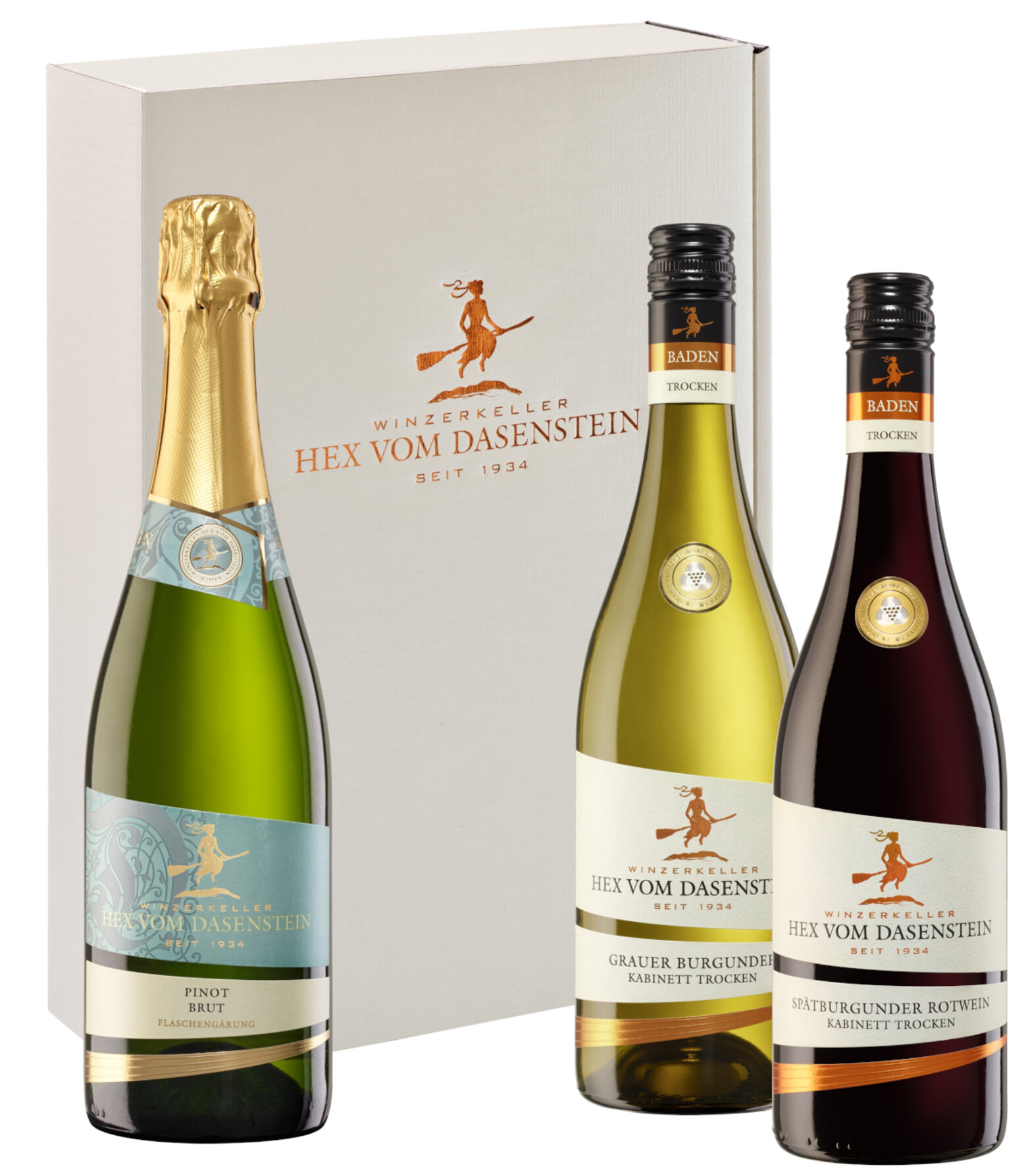 Zwei Flaschen Wein und eine Flasche Sekt im Geschenkkarton: