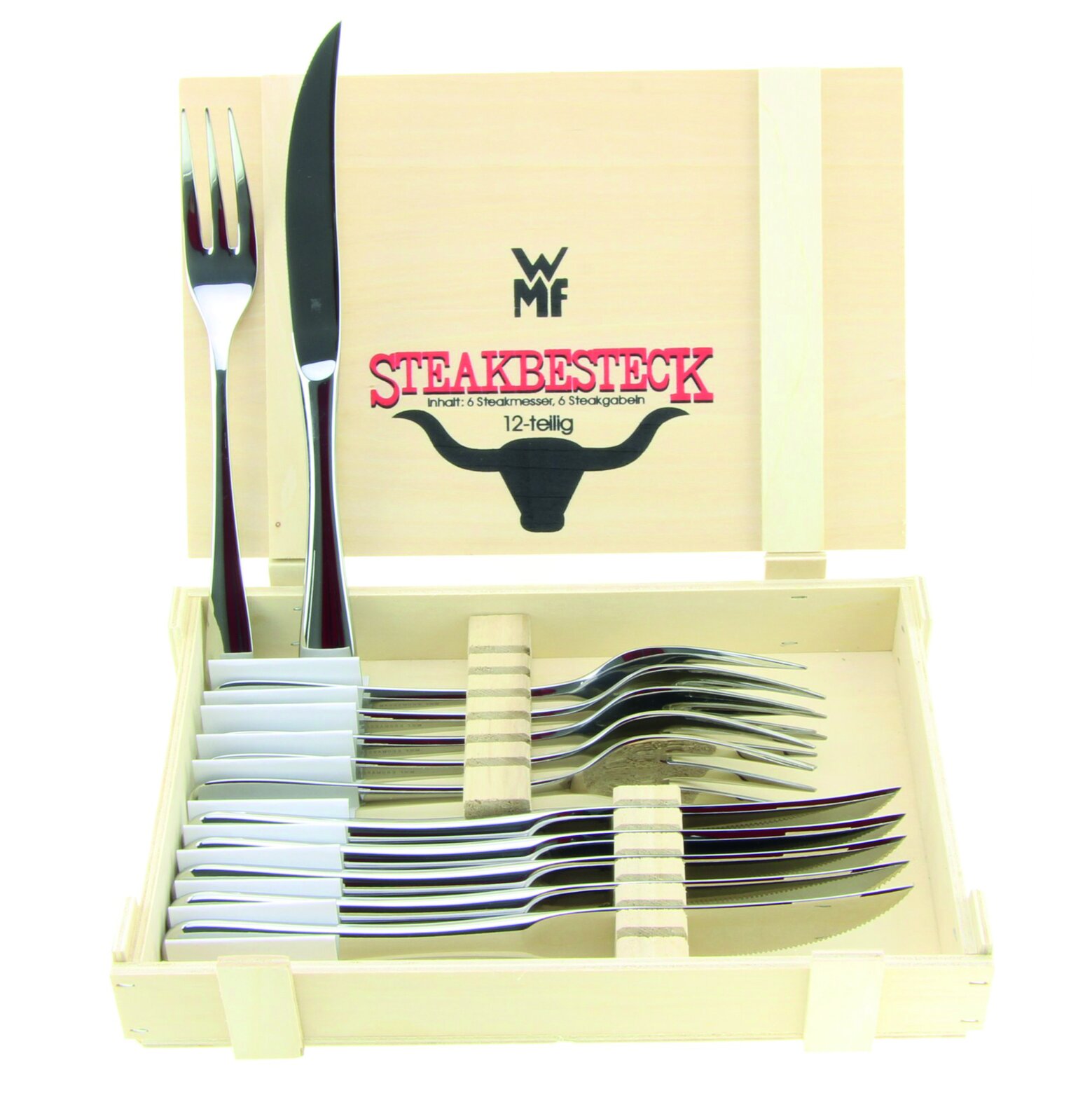 WMF 12-tlg. Steakbesteck in einer Holzkassette, Inhalt: 6 Steakmesser, 6 Steakgabeln, Material: Cromargan Edelstahl rotsfrei 18/10, verpackt in einer dekorativen Holzkiste